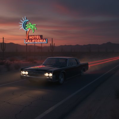 "Almost there," she says, nodding toward a flickering neon sign in the distance: a palm tree, a crescent moon, the words HOTEL CALIFORNIA glowing like a fever dream.