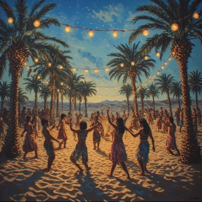 As he walks closer towards the lights, his feet begin to sink into the sand, and the music grows louder, more vibrant. He sees people dancing, their faces joyful, their movements fluid.