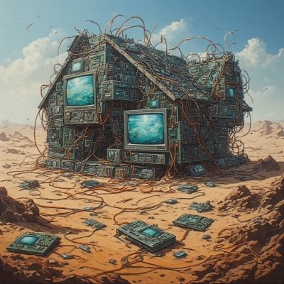 Looking closely at it, once they got close enough, they discovered that the outer walls were made of motherboards. Looking through a blank space where a window should have been, they saw daughterboards framed the interior walls. The roof was a mesh of wires and microchips, and some of the windows were screens displaying lines of code.