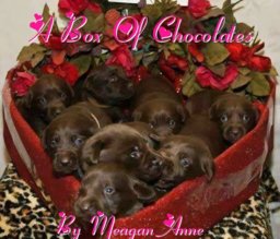 “I was hoping to deliver the gift as a ‘Box of Chocolates,’ but, as you can see, I didn’t think everything through clearly enough. It occurred to me as I picked the puppies up that there was no way I was going to get the dogs to sit still in the box.”