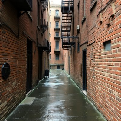 They turned down a narrow alleyway, the walls lined with crumbling brick and rusty fire escapes. The air was thick with the scent of decay and neglect.